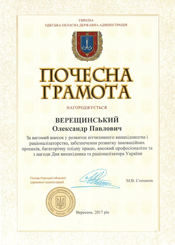 Почесною грамотою Одеської обласної державної адміністрації нагороджений і генеральний директор компанії “ОЛИС”, доктор технічних наук Верещинський Олександр Павлович, автор кількох десятків винаходів, велика частина з яких впроваджена і успішно працює в промисловості.